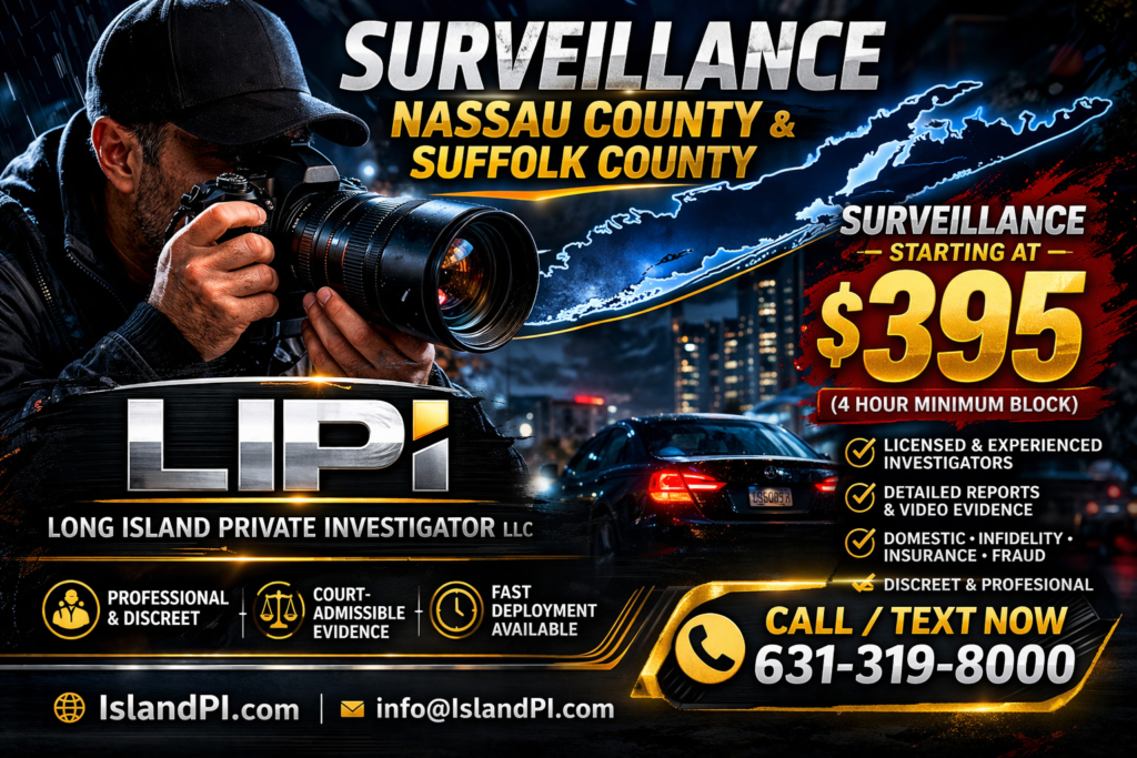 Long Island Private Investigator LLC offers comprehensive investigative services, including discreet surveillance, infidelity and domestic investigations, child custody matters, workers’ compensation and insurance fraud investigations, detailed background checks, missing persons investigations, and professional process serving throughout Long Island, New York.